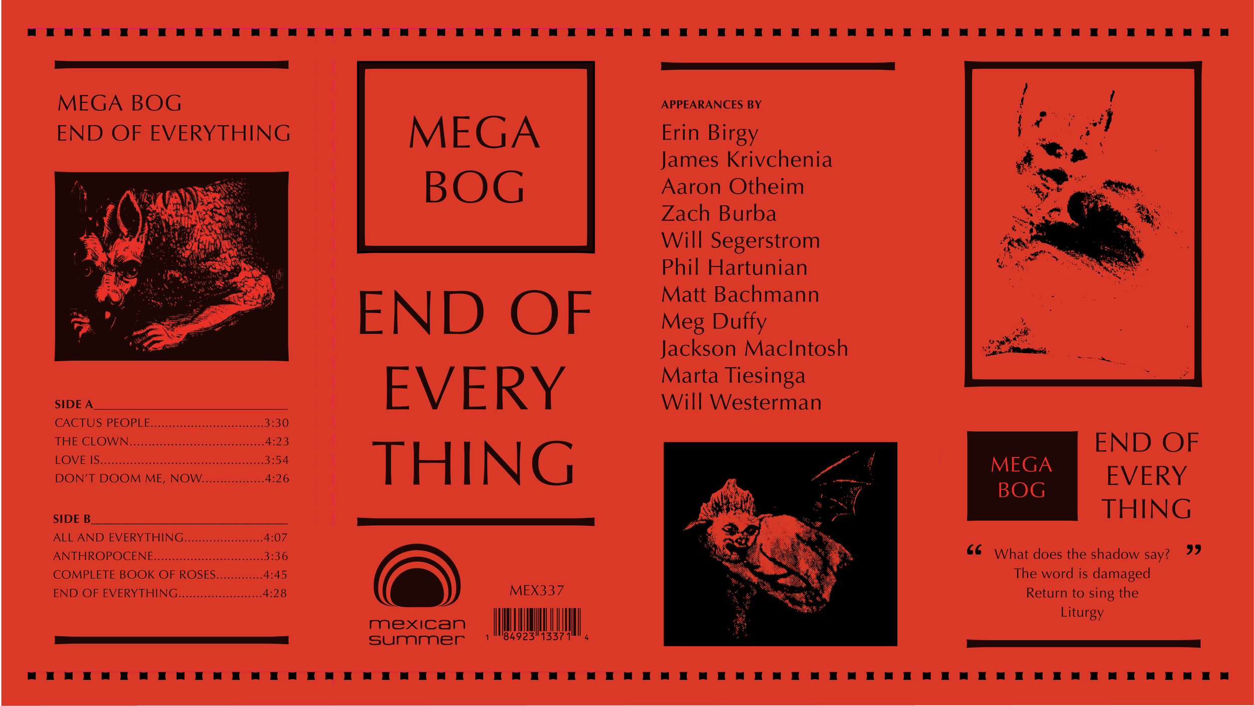 Neon red is reflective of the urgency, vitality, and passion (whether from fear, outrage, or both) that inspired Mega Bog to make the new album. Coursing through the design system, as if drawn from the earth’s molten core, neon red visually associates the physical components and the content within to themes of fire, heat, blood, and ritual.