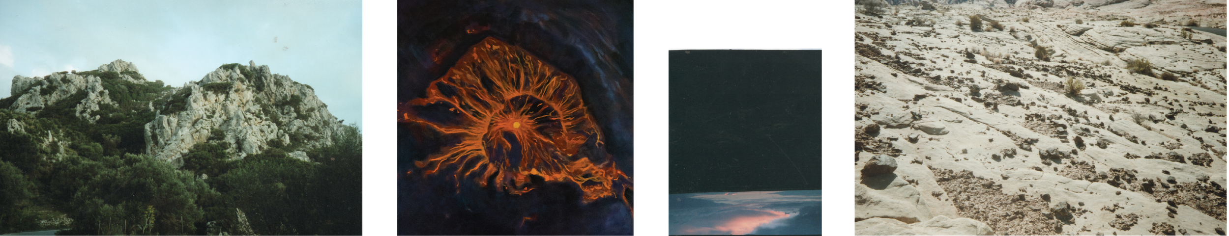 On the other side rests abstracted imagery made to appear, at first glance, like geological rock formations but is, in fact, a study of melted wax burned down during moments of meditation.