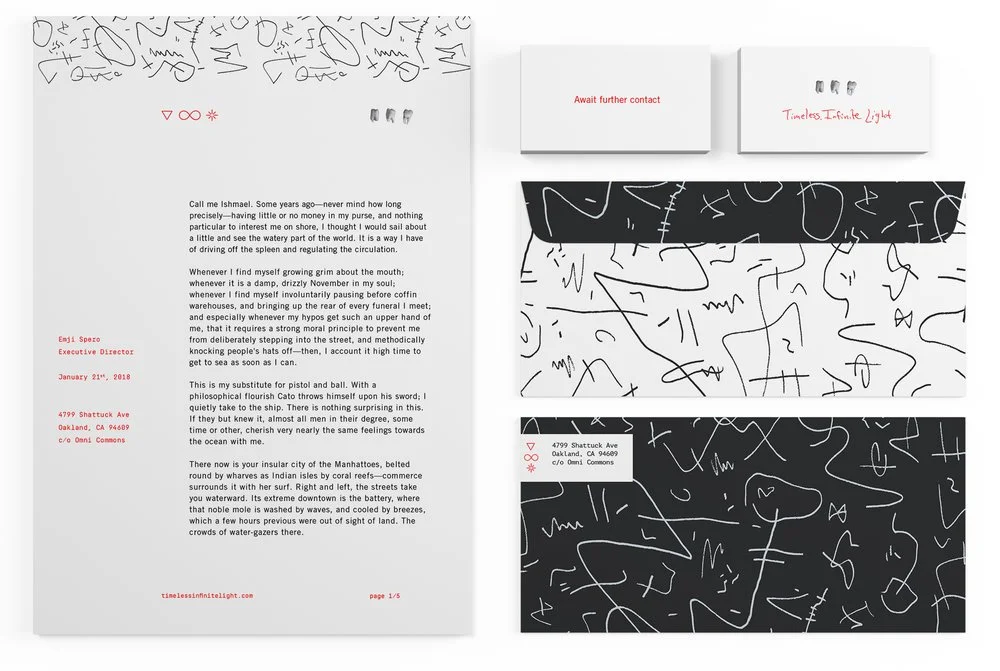 Stylized envelopes, letterhead, and other printed collateral ensured the Timeless, Infinite Light brand remained cohesive and cool in any communication.